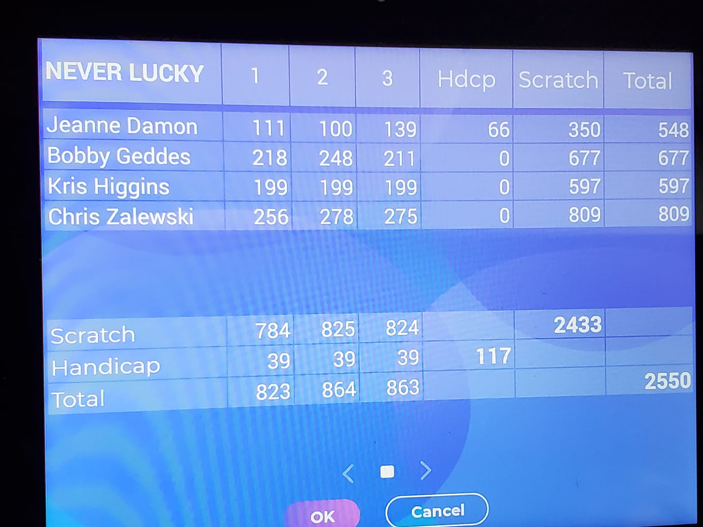 800 series have historically (at least in my time in the league) been elusive. The other night, however, Chris Zalewski, the gentleman in the photo above, posted 256-278-275 for an 809 set, the recap at the end of the night which is shown below (indirect thanks to Chris’ mother, Tina):
