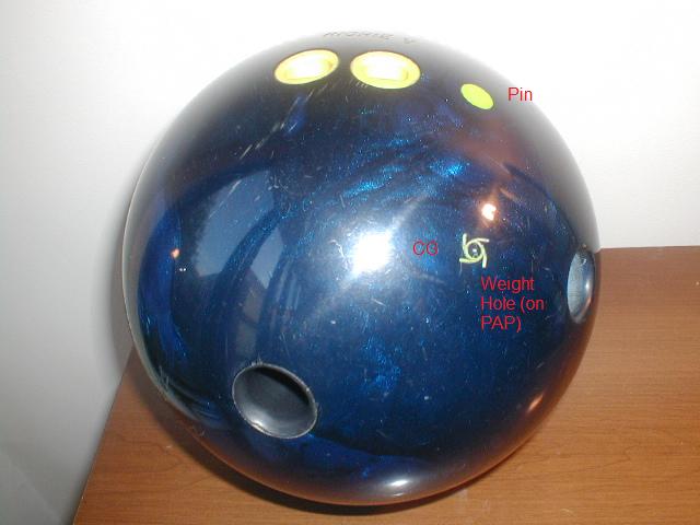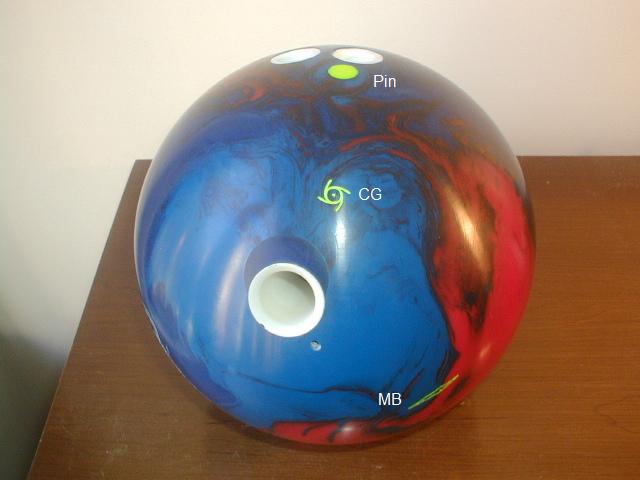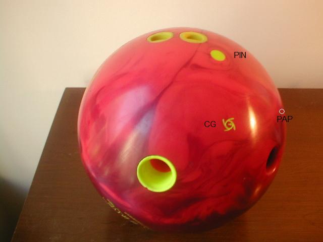 Like my Hy-Road, this ball has a stacked leverage layout, but you’ll notice that the weight hole is actually a bit below my PAP (which I eyeballed and marked on the photo). This points out that the driller also has to take core dynamics into account when laying out a ball, and, really, you can throw core dynamics out the window if the ball has illegal static weights. The Reign of Fire also has a duller solid coverstock, which rolls a bit sooner and helps me if the condition is a little heavier.